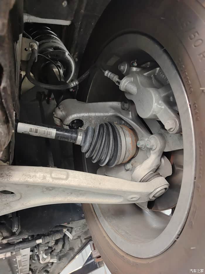 前轮是标准的麦弗逊结构,虽然不是很华丽,但绝对稳定扎实,看看羊角和下摆臂都是铝材,相当非常粗壮,让人很放心。也能看到非常大的刹车卡钳也是特别巨大,这么重的车,刹车必须有保障才安心。