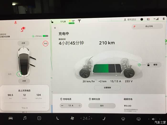 另外发挥说一下能耗和续航,今天阳光好,所以没开空调车里也很暖和,出门时表显303公里,到家时表显210+行程98.5=308.5(图一),比出门时还多了5km,原因是能耗只有124(图一)。根据这几天的经验,平均能耗只要控制在140以下,实际里程就不会比表显里程少。当然能耗跟空调、音响、大灯以及最重要的开车脚法有关,经验上来说,使用AP能有效降低能耗。