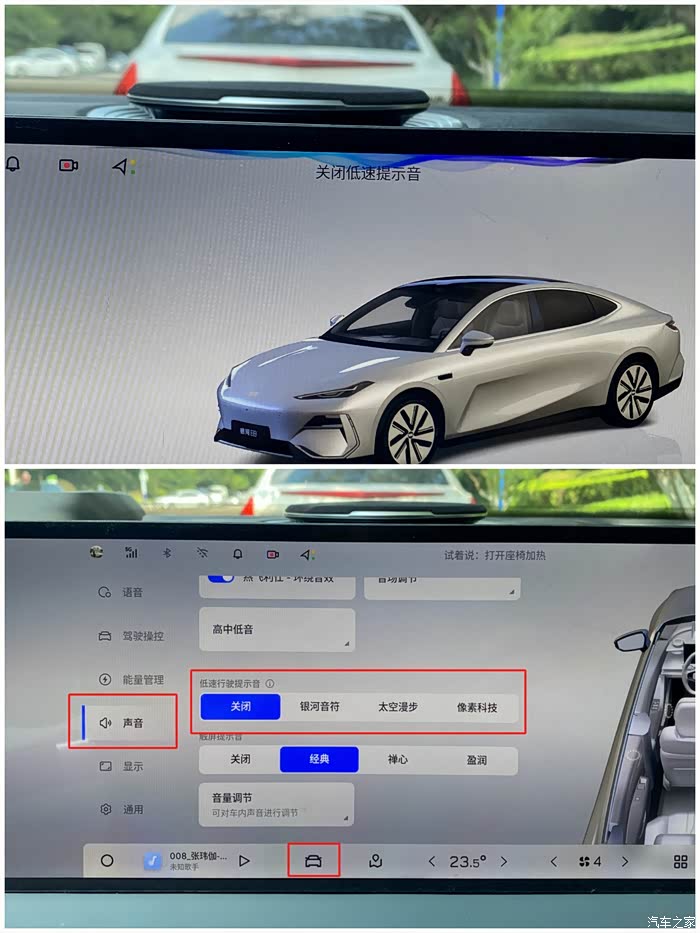 对于很多小白车主,特别是社恐车主而言,刚开始开银河E8的时候,总会发现开车后,车较慢时,车外会有音乐的声音,这其实就是银河E8的低速提声音。介意的车友在大屏幕上依次点击:设置→声音→提示音→低速行使提示音,然后此界面下可开启或关闭低速行驶提示音功能。也可以用语音控制,例如“ 你好,银河”“关闭低速提示音”。可惜关闭后,等下次车辆启动后,这个功能还会自动开启,需要再次关闭。