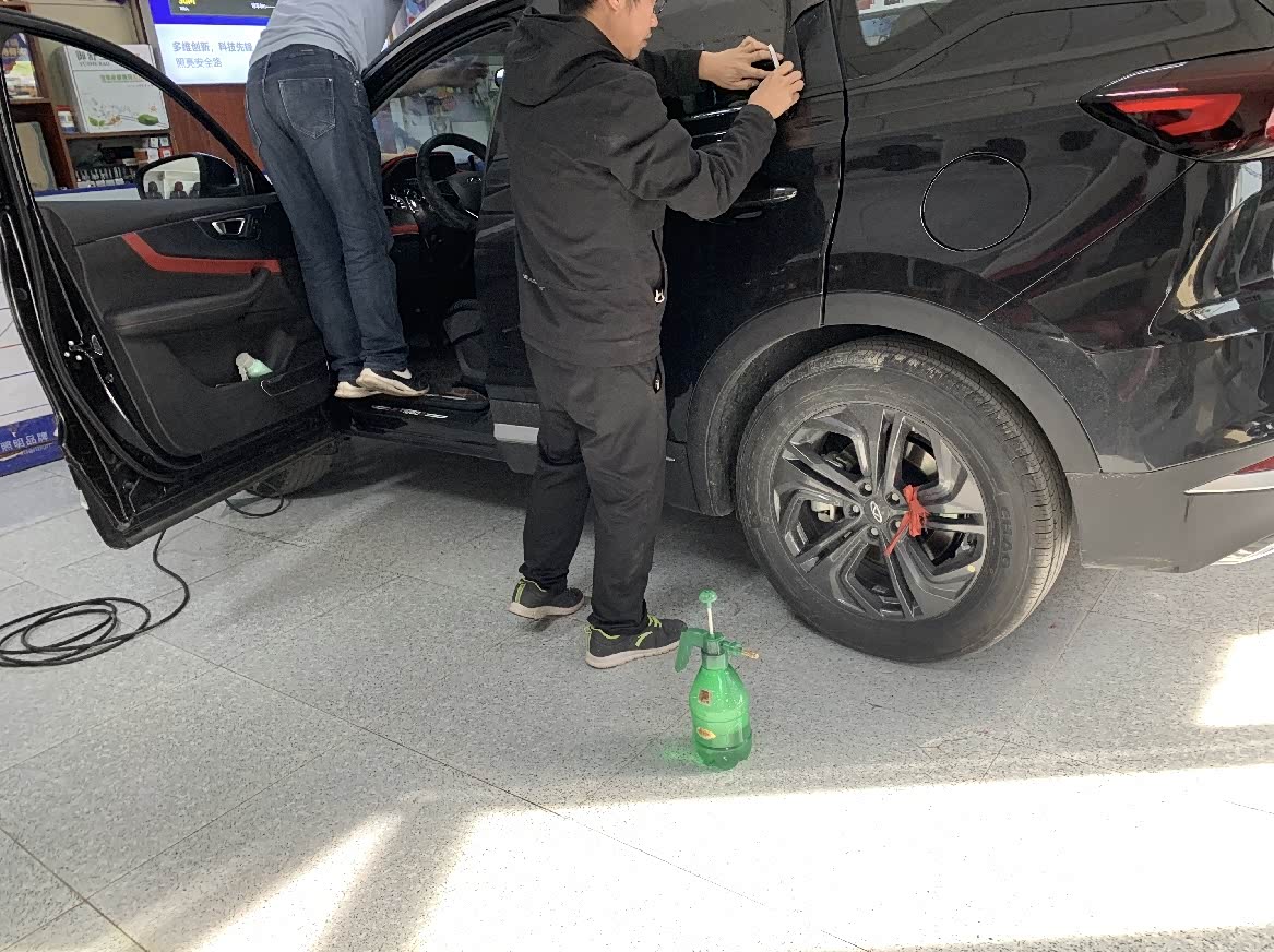 之前一直没给虎7贴膜,4s送的膜不想贴,感觉不是很热,但是后来感觉到还是想要隐私好一点,就想着有空去贴一下膜,倒了汽配城里面后,找到贴膜的地方,工作人员耐心的指导停车,停好车后,老板便开始亲自上手裁膜了,两个人分工合作