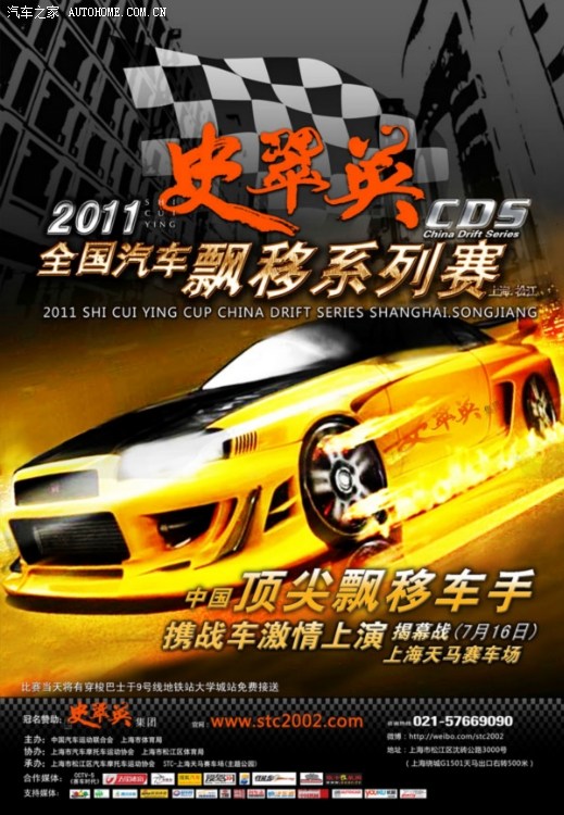 2011年7月16日,“史翠英”杯全国汽车漂移系列赛上海松江站在上海天马山赛车场胜利落幕。本次比赛吸引了杭州中策朝阳轮胎车队、佳通轮胎漂移车队、东洋轮胎CDF车队、浙江DMEN赛车队、上海谦毅SDT漂移车队、日荣车队以及杭州DRS车队等6支国内顶尖的漂移车队以及30名来自香港、台湾、浙江、北京、广东、天津、北京以及成都的漂移车手参加。经过昨天的排位淘汰赛之后,今天正赛中仍有33辆赛车参赛,堪称是全国汽车漂移系列赛参赛车辆最多的一次。