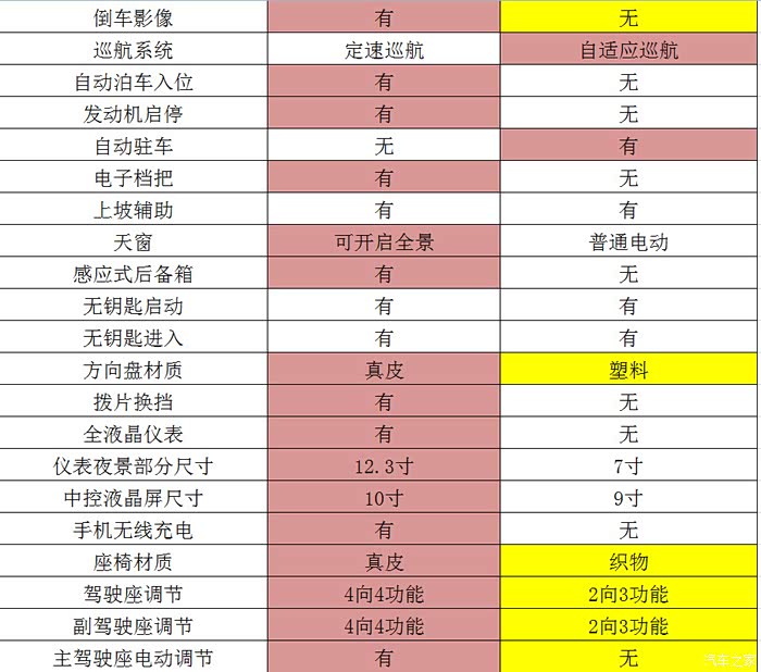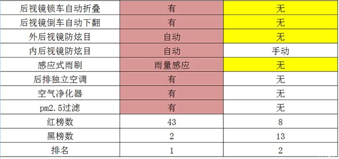三、红色背景即红榜,为明显领先项目, 黄色背景为黑帮,属于明显不该缺失或明显落后项目,白色背景为中性项目,不是每个“有”或者“无”都会直接打入红黑榜处理,-------亚洲龙大量存在的“无”,大部分做了中性化处理,而并不是打入黑榜,这是对亚洲龙配置比较的再次退步礼让。