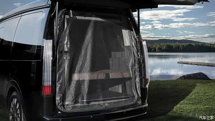 车身侧面,新车采用移滑门的设计,同时配备上了镜面轮毂和隐私玻璃,让整车十分的时尚且具有不错的私密性。新车的车顶进行了一些加装,可以支起小帐篷。新车的尾灯造型修长,点亮后拥有不错的辨识度。车尾还十分贴心的配备了防蚊帘,这样的设计使得出去露营能更好的防蚊虫,而且还十分透气。