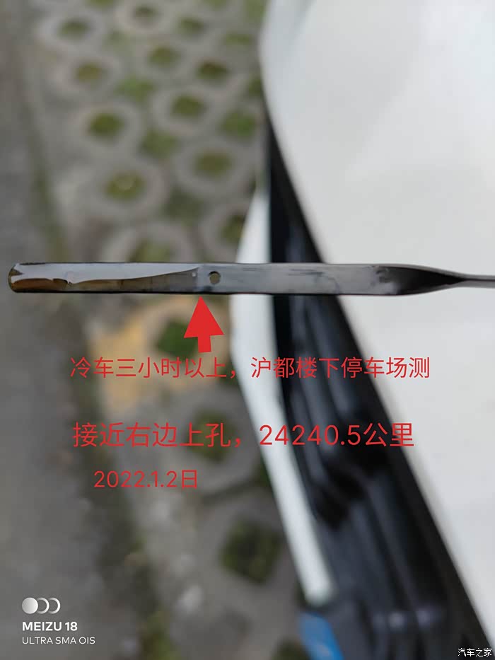 上次保养第二天,冷车,平整路面,机油液位距上限位还差点。