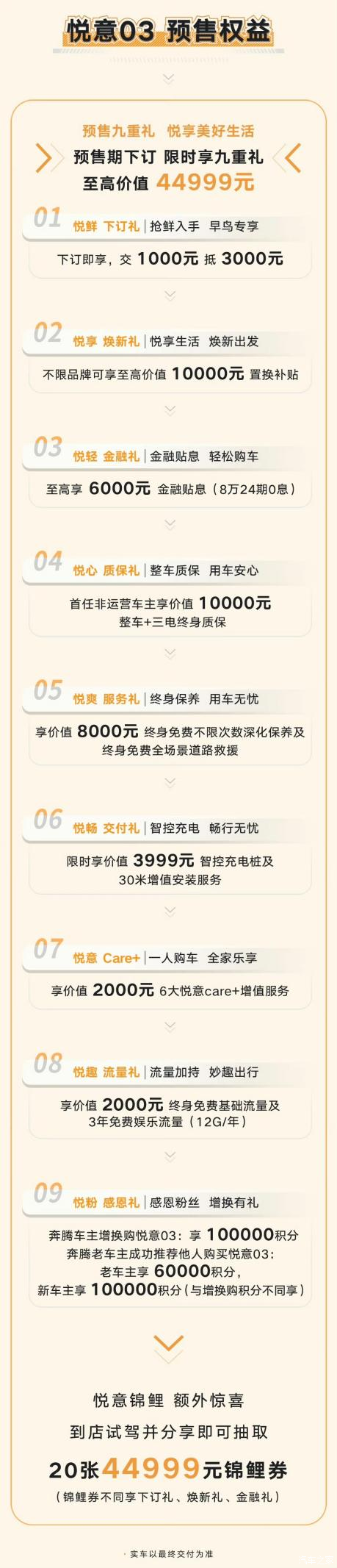 眼看着订婚的日子越来越近了,我这买车的计划也得提上日程了。看车看的也有一段时间了,一直没有确定下来,最近去奔腾4s店看了一圈,感觉新出的悦意03很符合我的用车需求,目前预售权益已经出了,看了下可谓是诚意满满的。首先它现在是支持下订期充值1000抵扣3000元的,另外如果有不同品牌的车置换还能拿下10000的置换补贴,看了一下更心动的,和女朋友商量商量准备拿下。
