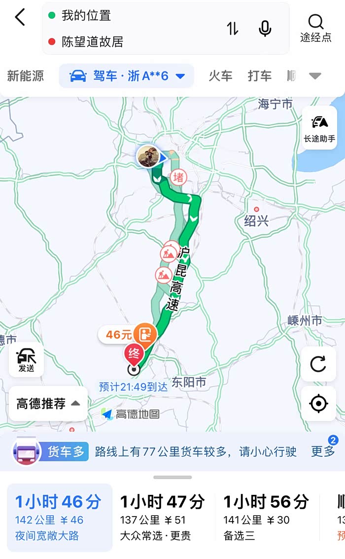 刚进家门,接到老爸电话 “单位组织去陈望道故居参观学习,那台G9杭州到义乌当天来回行吗?”老爸问道 “没问题,要何时出发”我都没多加思索回道,其实我根本不知道来回多少公里 “明上午9:00前要到的呢”老爸有点担心的说道,估计担心我会睡懒觉。