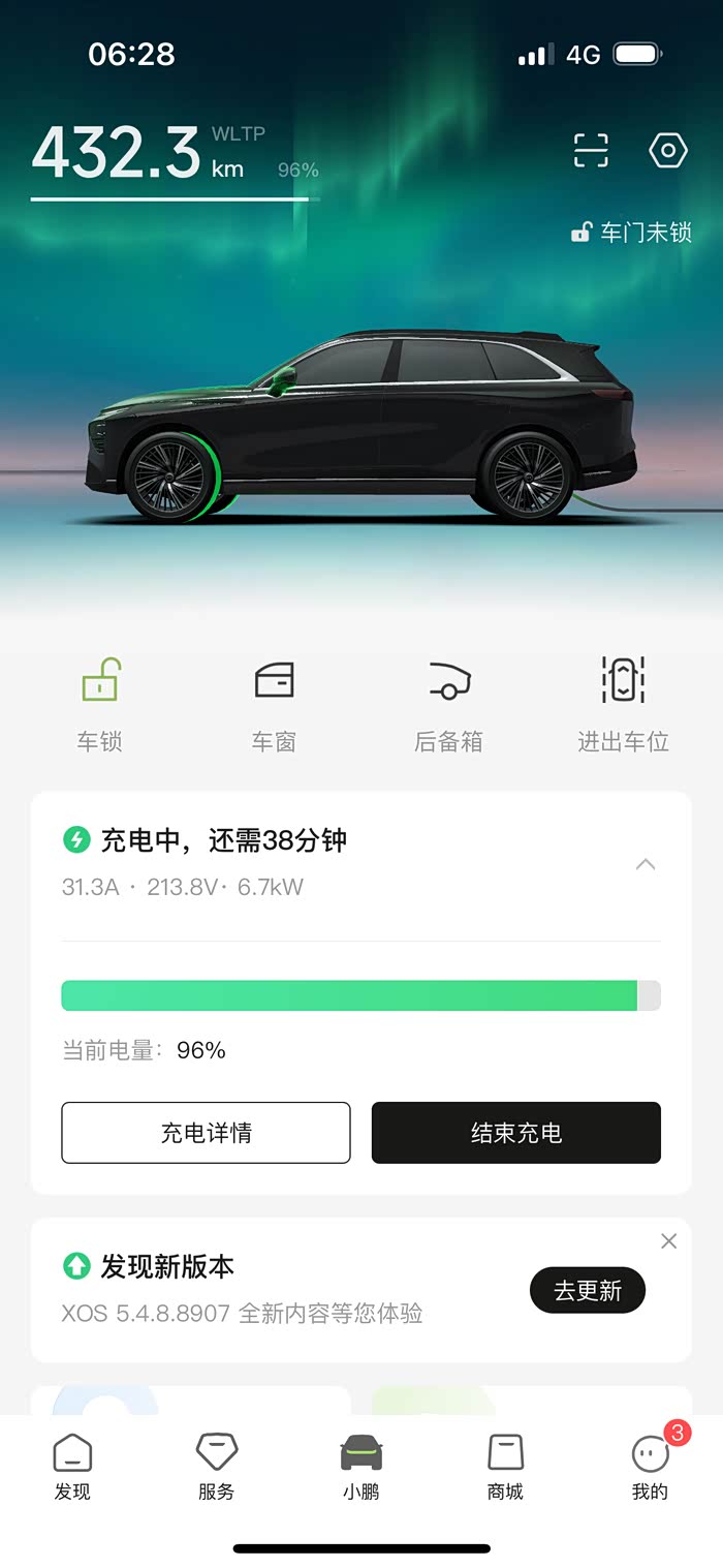 周末回家,G9通勤一周就要开始补能充电了,一般会在电量剩余20~30%开始充电,现在UI设计车辆真实感十足,背景就如冰岛极光之夜般耀眼夺目,好看!