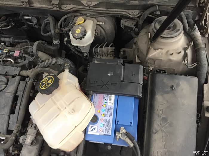 第二,很重要很重要,热车熄火后防冻液壶里高温高压,千万小心别烫伤,我是熄火6小时以后才作业的。此图壶的六点方向是电瓶,需要把盒子取下后方便操作。把壶从六点方向就是下方扯出来,地方很挤,用螺丝刀翘一下