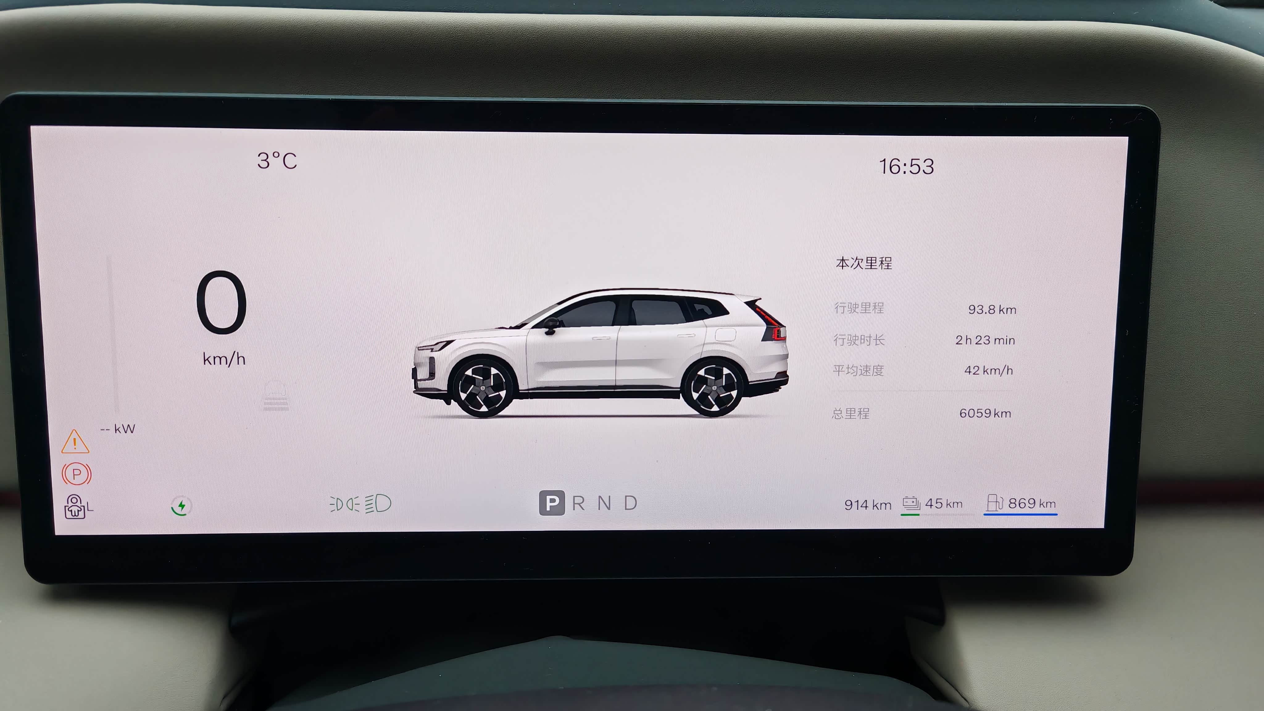 今天上海降温,车上显示车外温度为3℃,车内空调设定23℃自动,以高架为主的路程,部分外环路段车速上到100km/h,途径北翟路高架和翔殷路隧道时还遇到拥堵,平均时速42km/h。