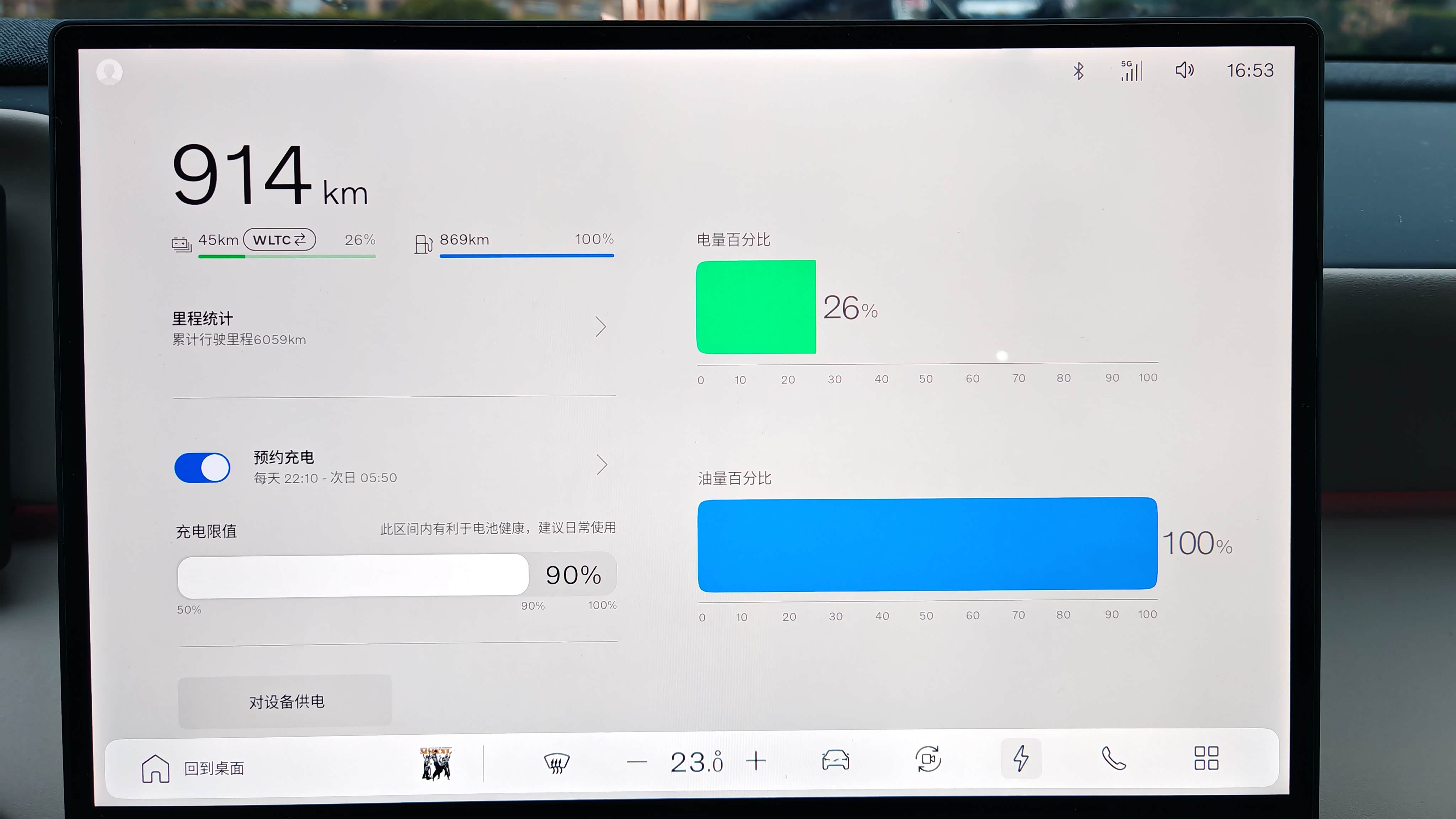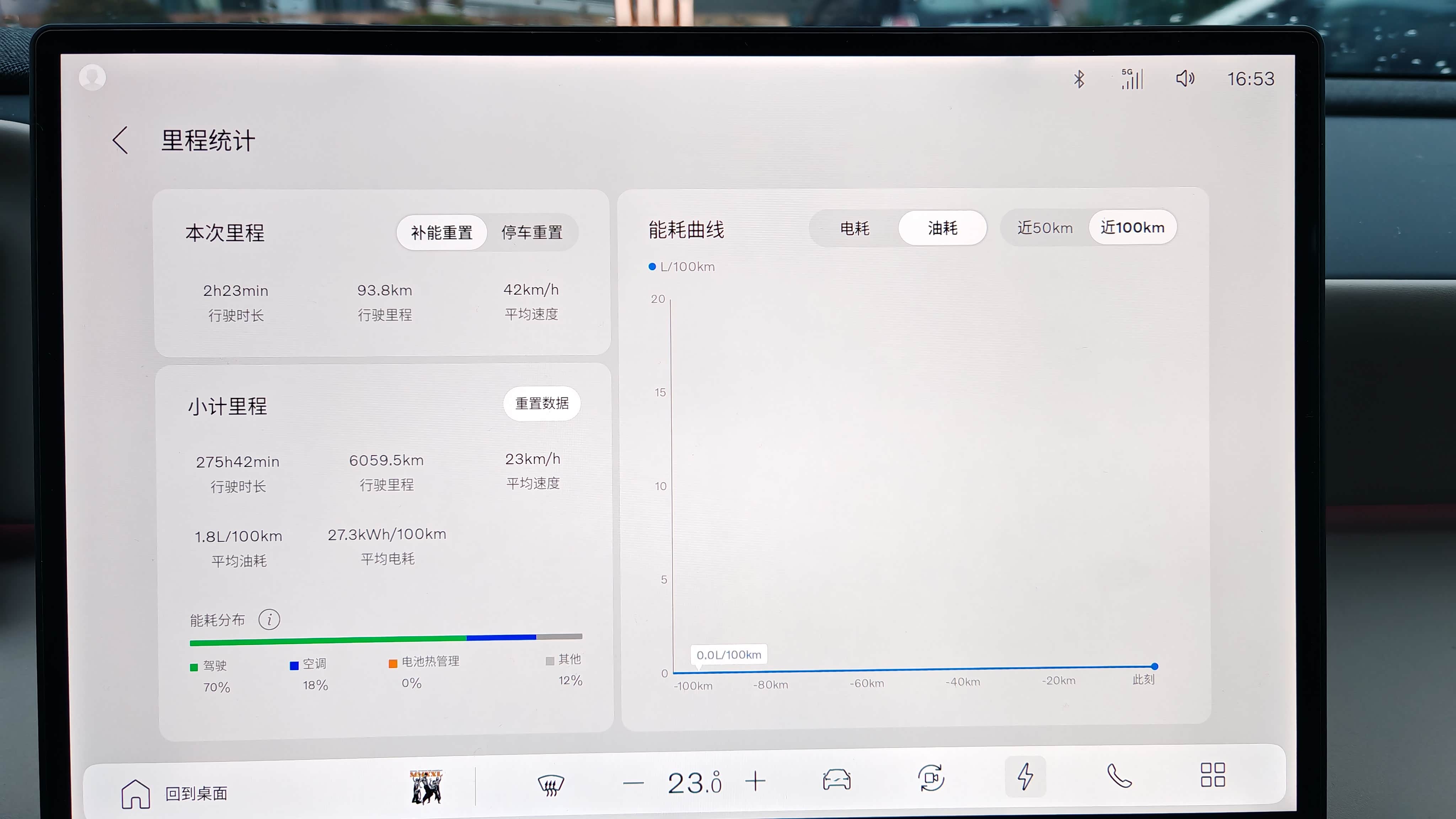 90%电量开始连续驾驶了93.8公里,消耗64%的电量,剩余电量26%。如果按100%电量开到剩余10%电量发动机强制启动的话,推算出极致纯电续航里程应该能跑到130公里以上。官方公布的WLTC续航里程是180公里,那么以目前的条件来看达成率高于70%了。