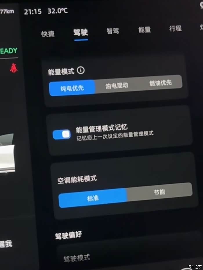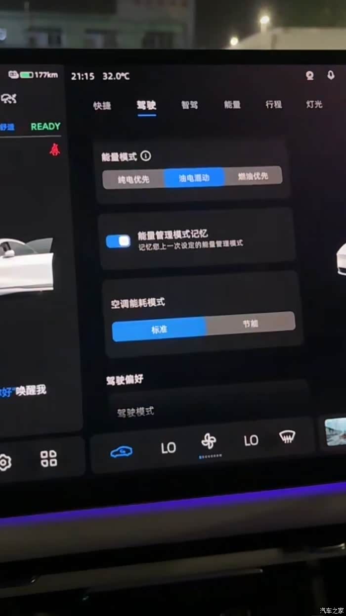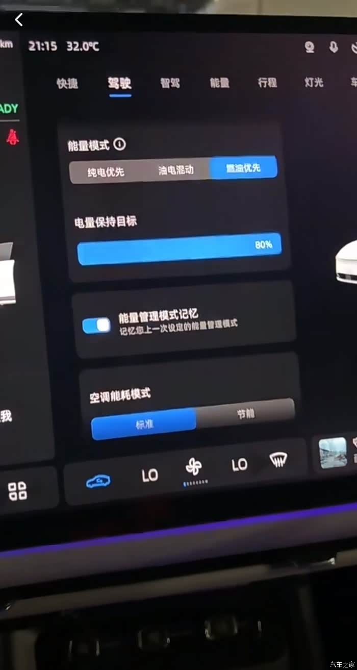 第三种:燃油优先,此时系统默认保电量为80%,也就是当纯电续航低于80%时,增程器便会启动,然后通过油发电来驱动车辆。在这种模式下,保电量可以调整设置的,调整范围为30-80%。燃油优先模式,一般我只会在回安徽老家(全程1100公里)开长途的时候才会使用。