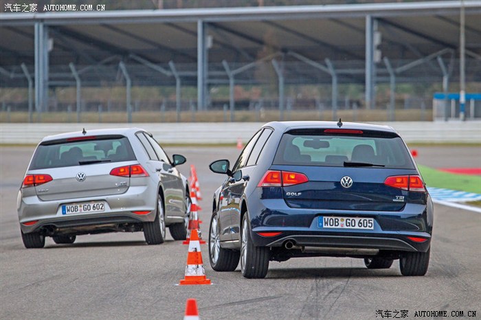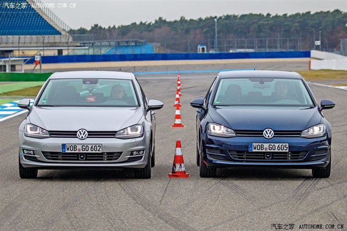 两款VW Golf。左边银色为1.4TSI配备多连杆后悬和自适应减震器。右边蓝色为1.2TSI配备复合拉杆扭力梁后悬。