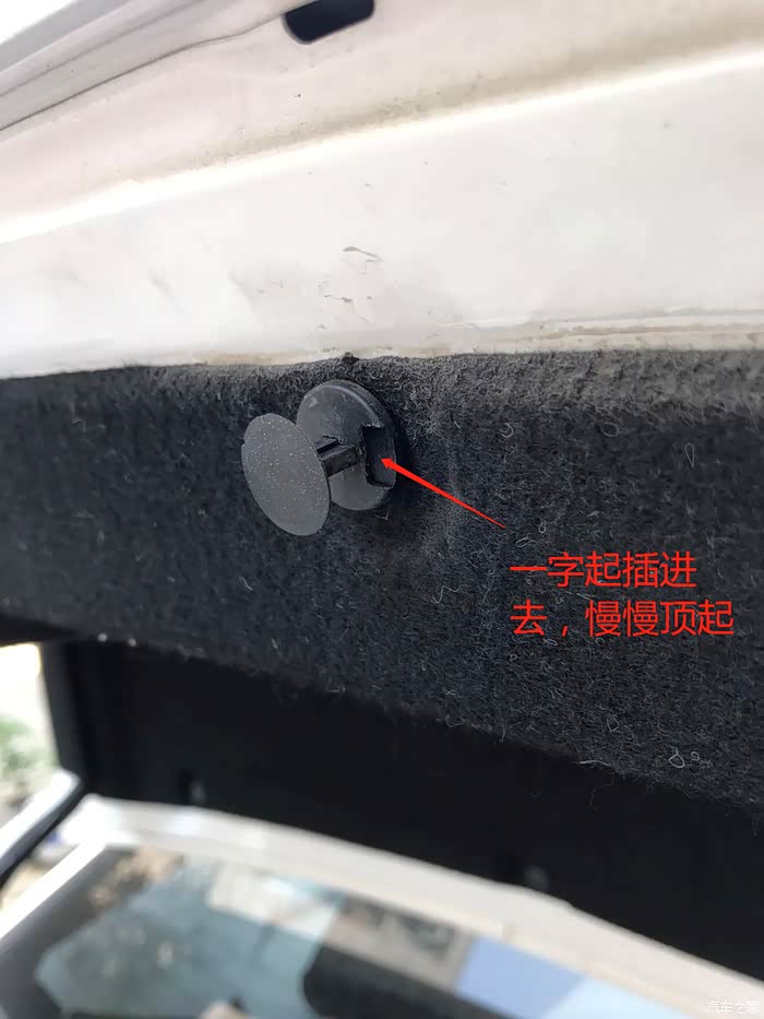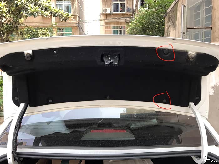 第一步,后备箱打开后找到后备箱卡扣(红色圈圈处,大概有12个)