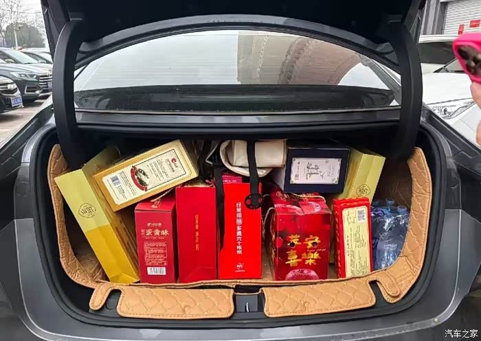 想着给亲戚带些干货,又加了一箱红枣和两盒坚果,后备箱居然还有富余。它常规容积就够能装,开口高度适中,搬重物不用费劲。买完所有年货,后备箱被一箱箱礼品填得满满当当,却没显得杂乱,侧壁的挂钩还能固定零散购物袋,特别贴心。