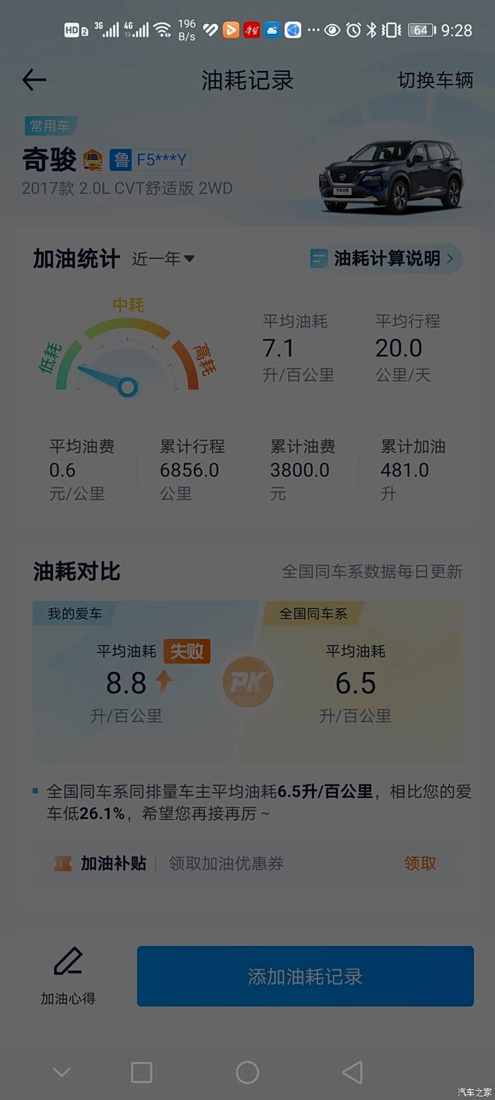 首先,对于我们车子来说,最大的花费,那就是加油。日产奇骏在省油方面做的还是挺不错的,目前我车子从买到现在对综合油耗一直没有进行清零和重置,目前油耗一直是控制在6.9,所以说在燃油费方面,我也通过汽车之家油耗记录,每次加油都进行了油耗记录,所以到现在目前为止,我的加油费用大约是3800元!