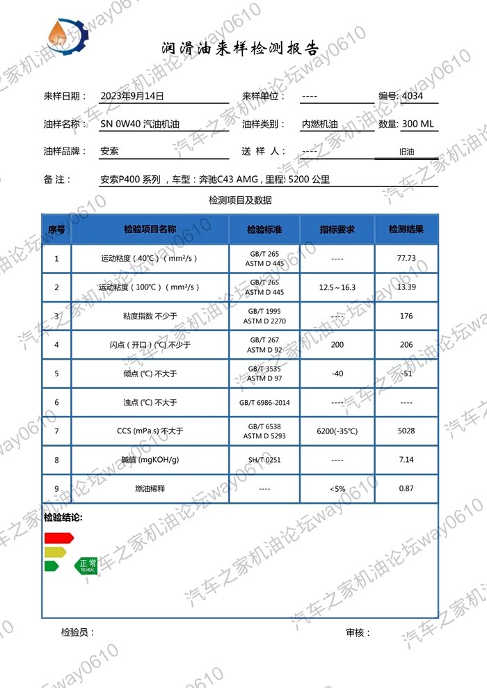 机油送检532篇-安索P400 0W-40奔驰C43 AMG