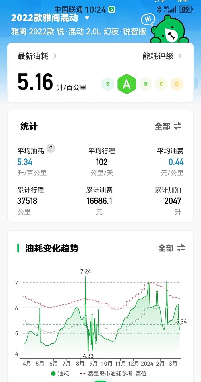 (二)年累计平均油耗:5.34/升100公里,每公里油费0.44元,加满一箱油最低油耗4.33升/100公里,最高7.24升/100公里。