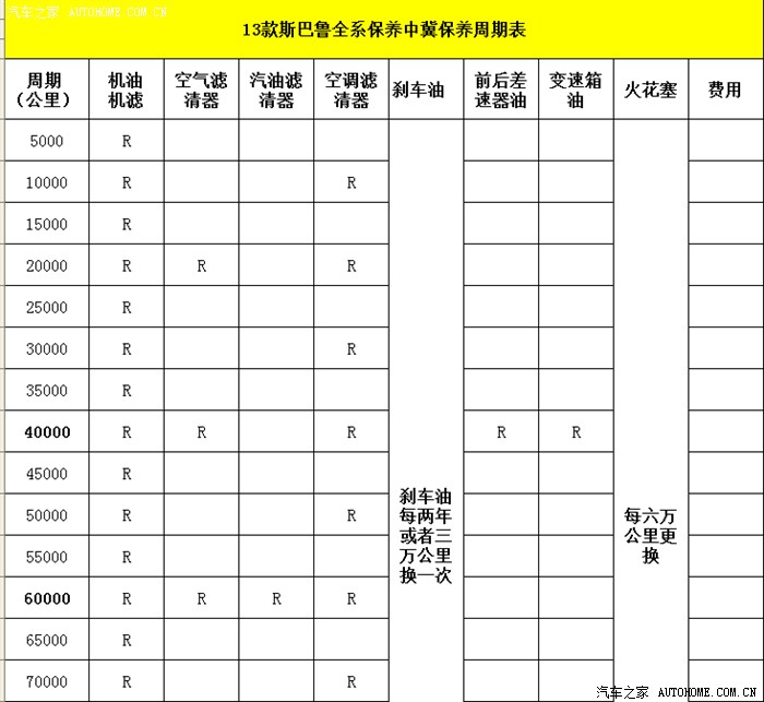 “行驶超过12000km(7500英里)或者96个元后要继续进行定期保养。”这句话的意思说也就是在一万公里以内车实际上是不需要保养的,超过一万公里才开始保养。然后在看看保养周期,原厂的保养周期是15000公里或者一年才开始保养,说明斯巴鲁的车的保养周期实际上是非常高的,国际标准保养一次,国内的经销商竟然让保养三次……这个经销商的钱是不是赚的太黑了啊。原厂的保养手册说明的恶劣天气中,中国的符合的情况真心不是很多。虽然中国的天气相对于比较恶劣一些,但是原厂中特别标注出来的两个极端条件下的国家一个是以色列一个是俄罗斯(一个极端干旱,一个极端寒冷)。但是按照一万公里保养也是完全没有任何问题的,下面是我重新制作的表格,主要是超出六万公里以后,大家可以按照原厂的保养手册进行保养,我把保养周期定到一万公里。如果按照一万公里保养的话,大家既省心又省力,而且一万公里一保养比起原厂一万五千公里的保养周期还要少很多,所以大家不用担心其他的问题,既然是进口车,其他国家都是按照这个标准来执行的,中国为什么在一个小小的保养上面却要搞特立独行呢……