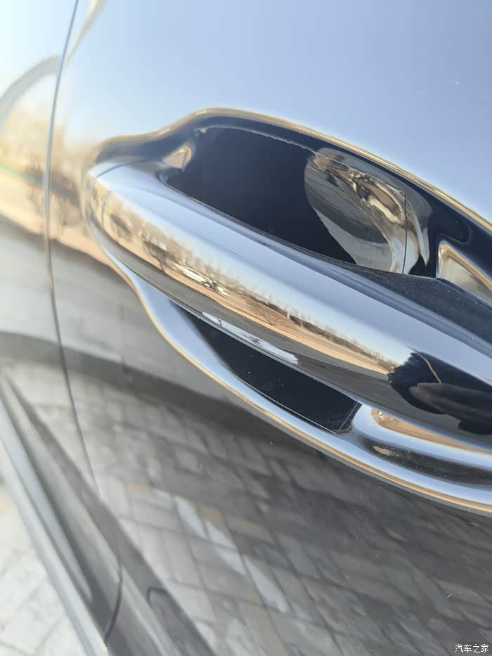 再仔细一瞅不光有划痕,连带着有一个坑啊。前侧的副驾驶门把手上也蹭掉一块漆面。