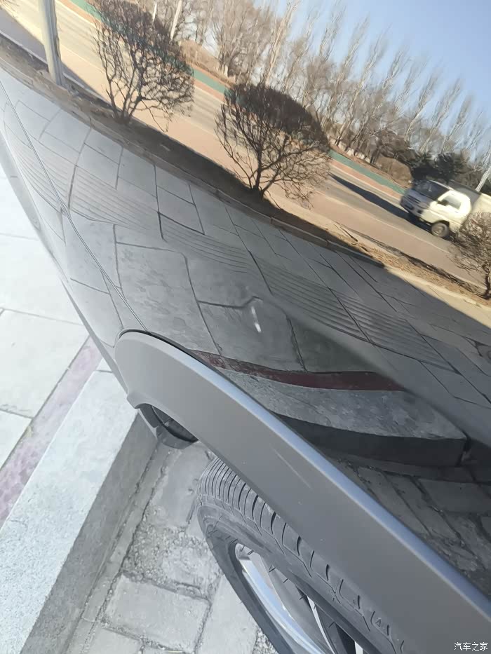 发现右侧后轮的位置有块白色划痕。