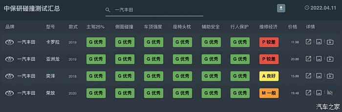 自2019年开始,中保研就自费对在售乘用车进行碰撞测试,并将测试结果公之于众。然而令人惊喜的是,小到奕泽,大到亚洲龙,一汽丰田TNGA架构下的产品,除了维修经济性指数外,不论是驾驶员正面25%偏置碰撞、侧面碰撞、车内/外成员安全指数,还是车辆辅助安全指数,都取得了全优(G)的成绩。