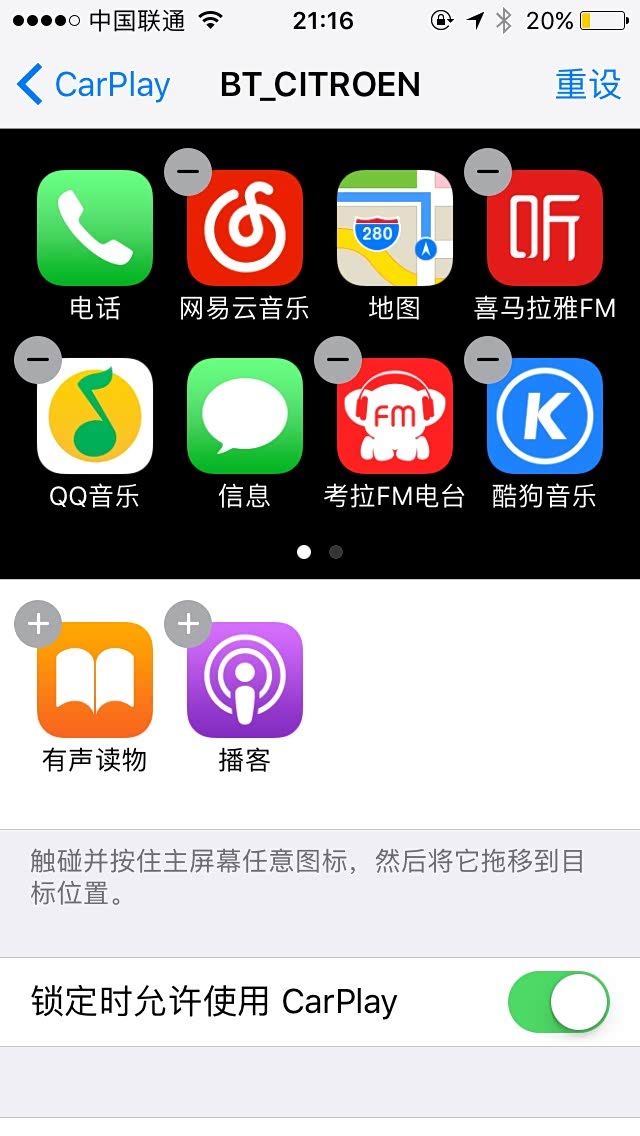 Carplay功能可以分两方面来说,一方面未越狱的苹果手机在连接咱们的C4世嘉之后,功能上有一定的限制,比如只能用来接打电话、用酷狗或者网易云音乐听歌、用苹果自带的地图软件导航,然而手机上其他的软件则无法在车上使用。