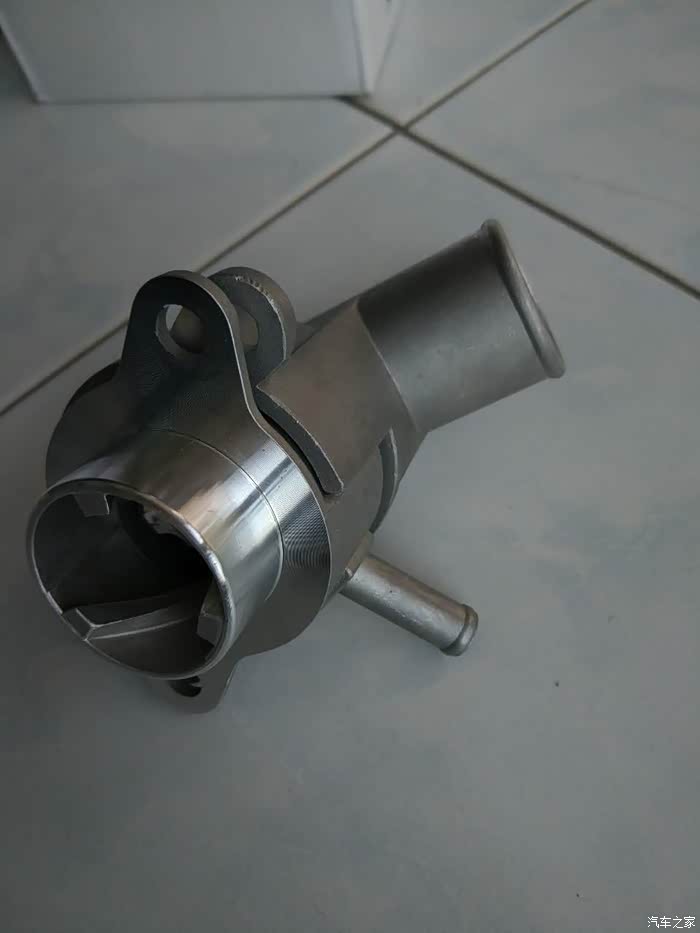 分体的铝合金节温器两个配件分别连着大水管和小水管。(节温器阀芯已拿掉了)