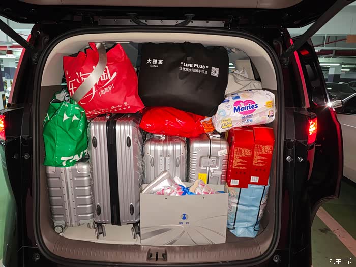 这个后备箱,是在保证前排座舱乘客舒适度最大化的情况下,实现的载物能力。腾势D9每次出去自驾游或者过年回家,能装载的行李装备是真的多。