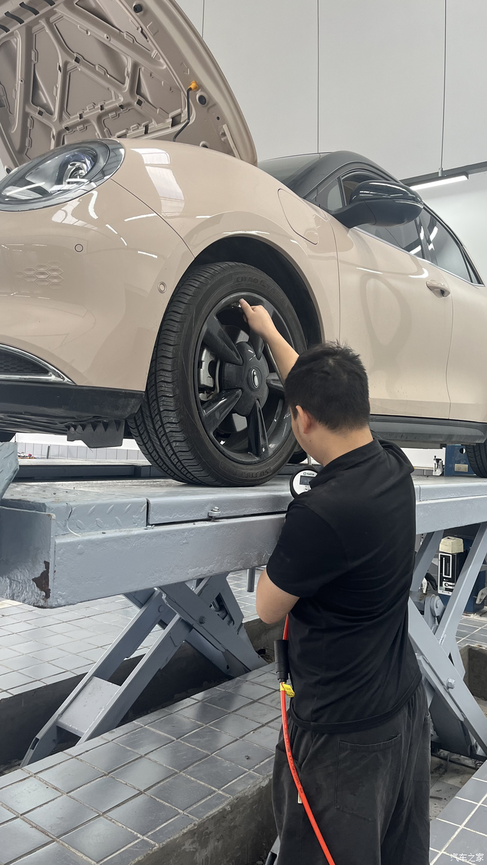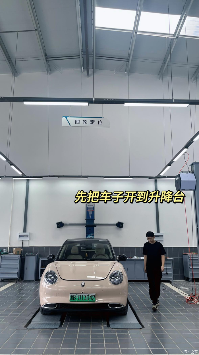保养的第一步是四轮定位。工作人员先把车子开到升降台上,对车轮的定位进行精准调整,确保行驶稳定和轮胎磨损均匀。