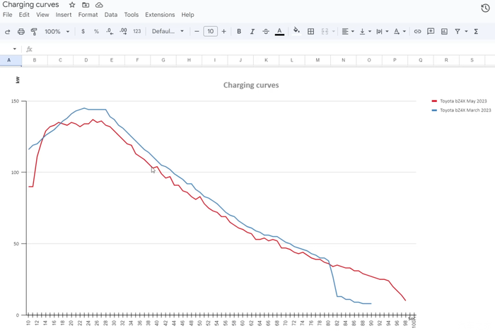 从10%电量开始充电,大家看图,蓝线是3月份升级前的bz4x,红线是5月份升级后的bz4x。