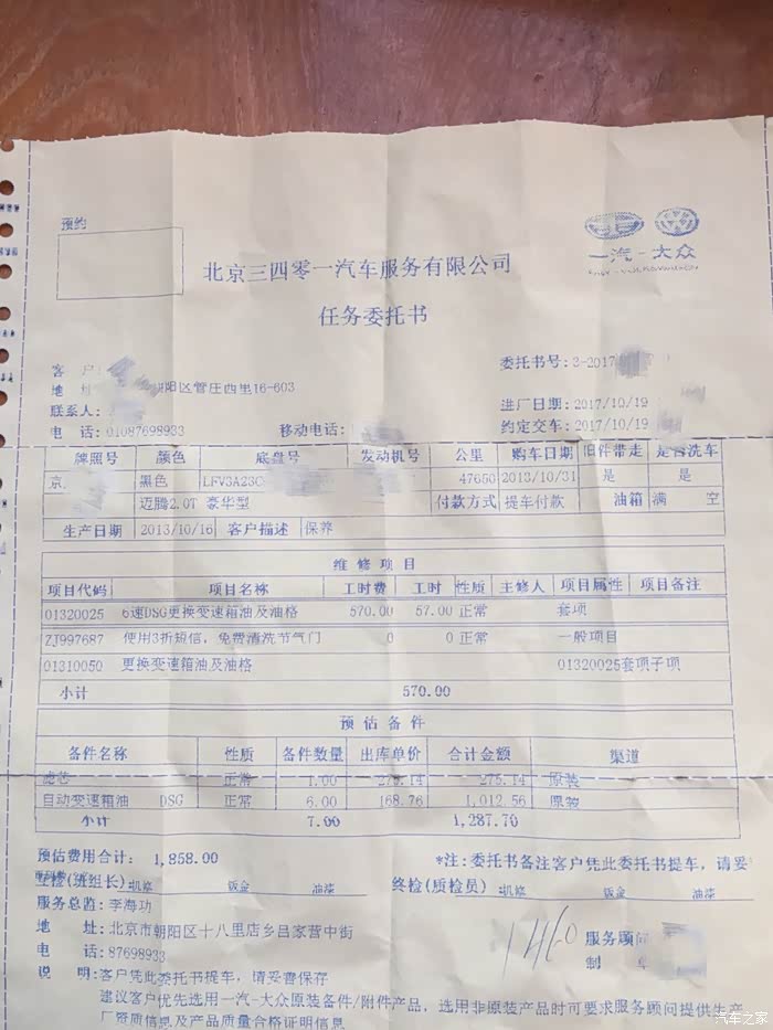 6桶油1012,荷兰滤芯275,工时3折后是171,共计1460元。赠送免费拆洗节气门。