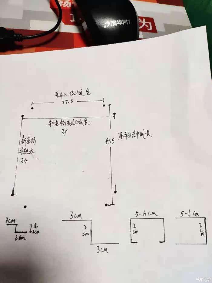 回来以后画了下面的图,mini座椅的孔位比原车宽2厘米,比原车短6厘米的样子,找淘宝上定做了转接钢板,做的5毫米厚的,8根一共160。