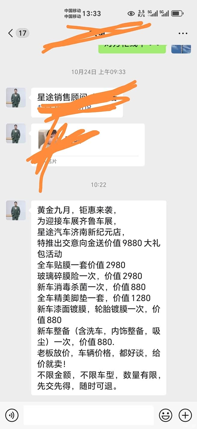 再就是合同送的全车贴膜和脚垫得收取工时费!工时挺贵的,自己安装还不同意!还明确告诉你他是很差的那种,你要不?他的言外之意就是这么差的车膜你贴上透光不好,各种问题,搞不好容易废在路上,不能用!得换好的!懂得都懂换的很贵很贵!