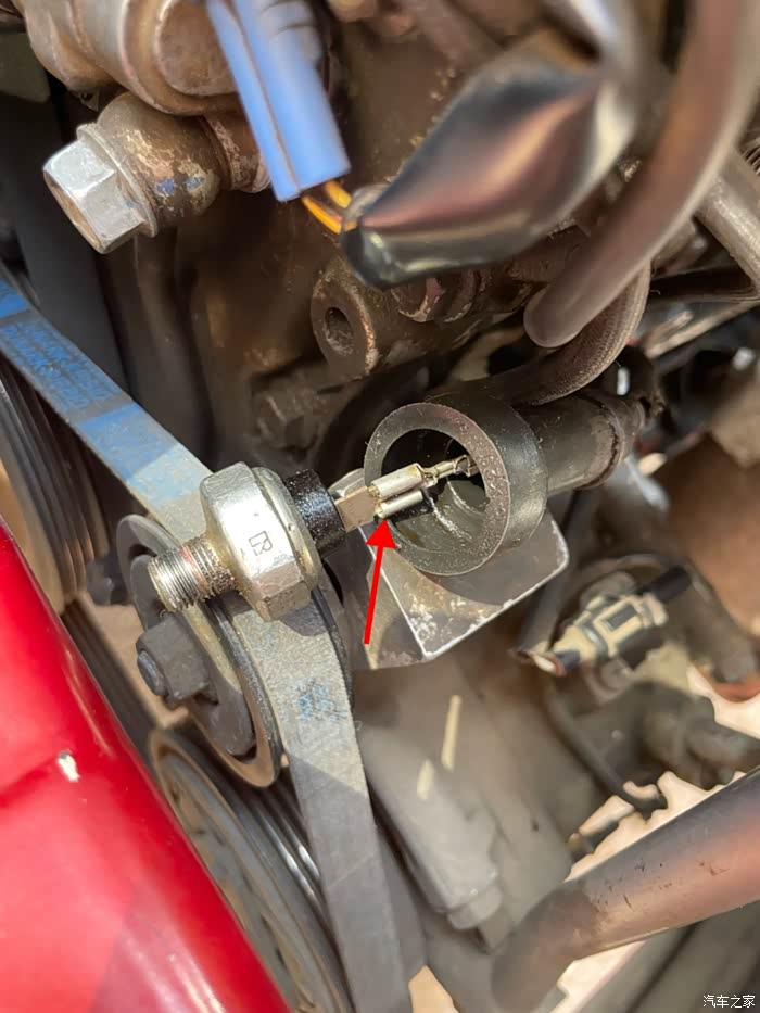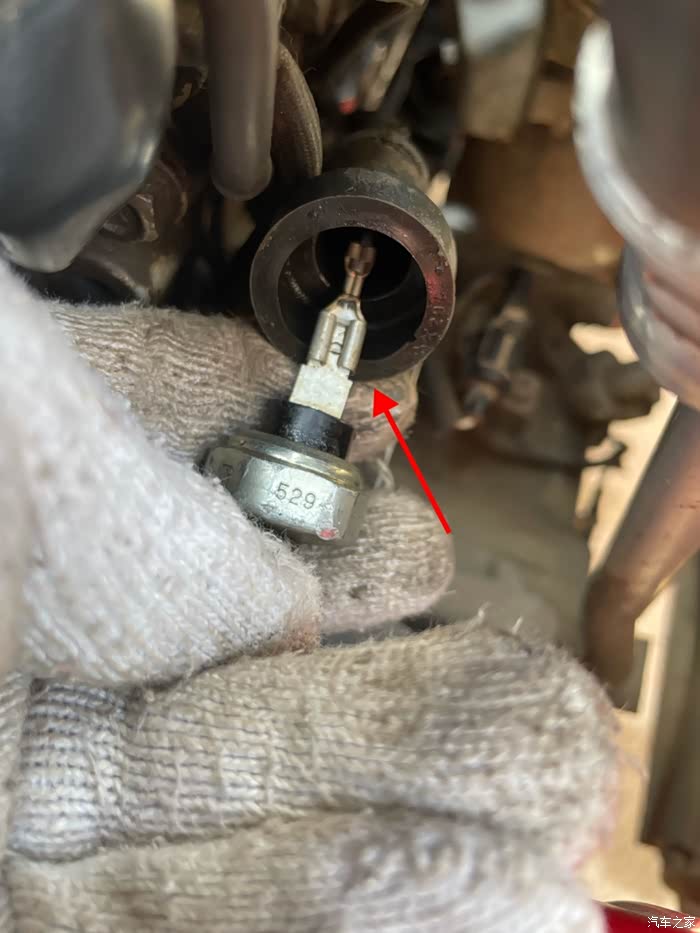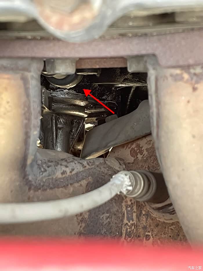 图片剪头位置,就是机油压力传感器,有的会从根部螺丝口渗油,有的从传感器上面接线的铜片根部渗油,内部渗油,最好更换掉,虽然也不影响行驶,因为它下面就是高温排气管,渗油容易渗到下面那个氧传感器上我的渗油不严重,更换机滤垫圈后,发现上面也有油渍,就决定也一起换了,就有了下面这些过程……