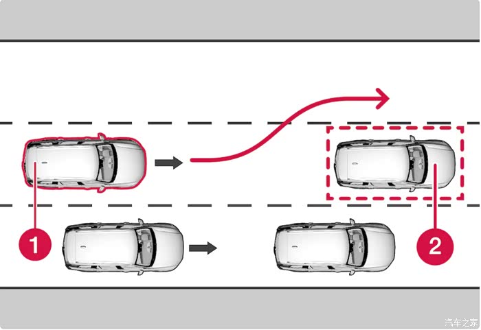 第一个:提前刹车。当正常行驶中,你的车(1号)发现前面有比较慢或停下来的车(2号)的时候,会不断的看两边车道有没有可以避让的车道(只使用前置摄像头和前置雷达),如果发现有避让车道,就不会采取任何动作,因为系统假设司机知道有避让车道的事实,系统假设司机自己会打方向避让;如果发现两边车道没有避让车道,这时候安全系统就会介入,提前刹车减速。这就是第一个安全功能。