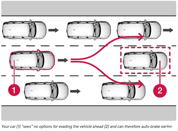 这也同时清楚的解释了另外一个现象:有些评测发现沃尔沃的主动刹车不能完全刹停,最后还是会轻轻撞到前车。这不是沃尔沃的安全系统没有看到前面车辆,而是他的提前刹车功能认为两边有避让路线,认为司机会自己避让,所以不会提前刹车。直到最后离目标很近的时候,发现司机并没有采取避让动作,才会紧急刹车。这其实也很有道理,在实际路况中经常前面有肉车,大部分情况我们都会自己避让,但如果每次安全系统都去主动刹车的话,也会增加后车追尾的风险。