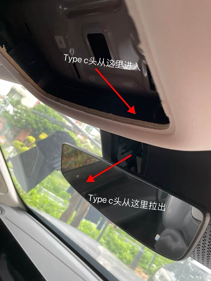 现在将取电和降压线组从小白头处分离,先进行降压线组type c口穿线,由于顶棚进线口洞很小,这个时候就是耐心把Type c头用手指一点点捅进去,由于我选的是L型难度略高,如果是直型会更容易。