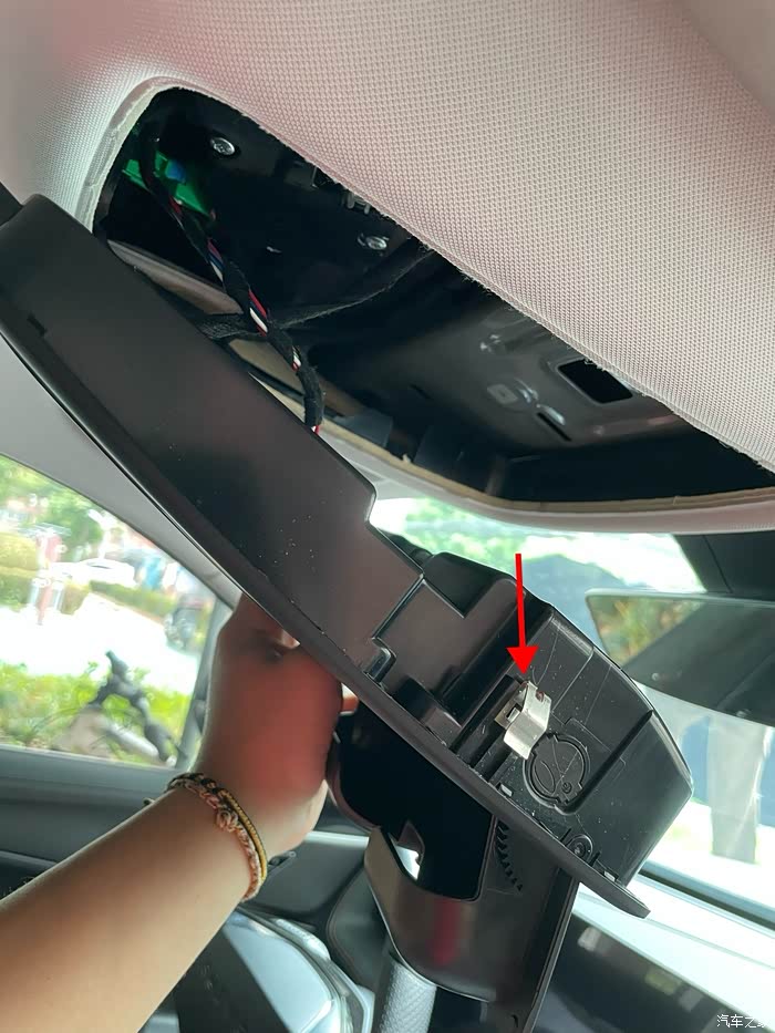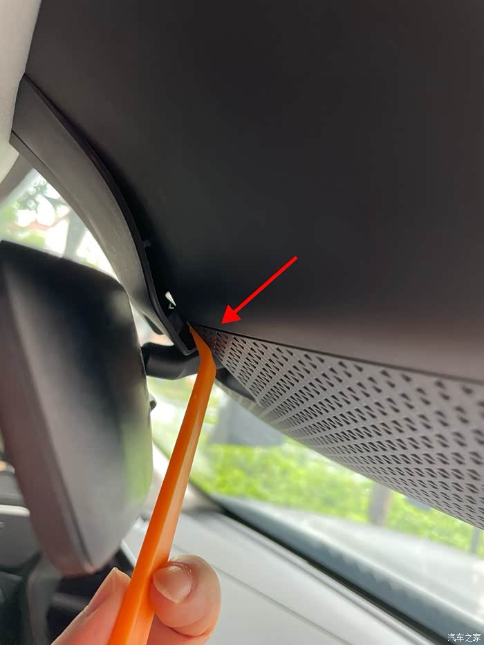 取下阅读灯总成以后,准备左手取下原车后视镜支架位置保护板,这里是车辆记录仪和车道保持总成,不需要拆下,只需要打开一个上盖,重点!用撬棒对准下图接头处一顶即可,重点再次提醒,这里不要用蛮力,也不要在后视镜支架借力,否则后果是支架断裂甚至导致挡风玻璃破碎!重要的事说三遍!
