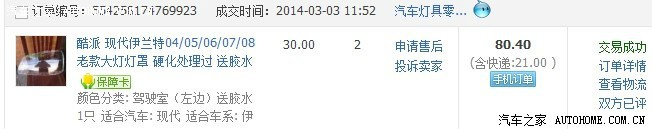 有了想法就开始实施。先是在淘宝拍了两个大灯灯罩,一个30块大洋,两个加运费共花去了我的80块币币,心疼地。(购物记录如下,非广告,淘宝就那一家卖的,也没必要广告)昨天,也就是周日上午就收到货,正好乘周日空闲,下午就抽时间开始施工。