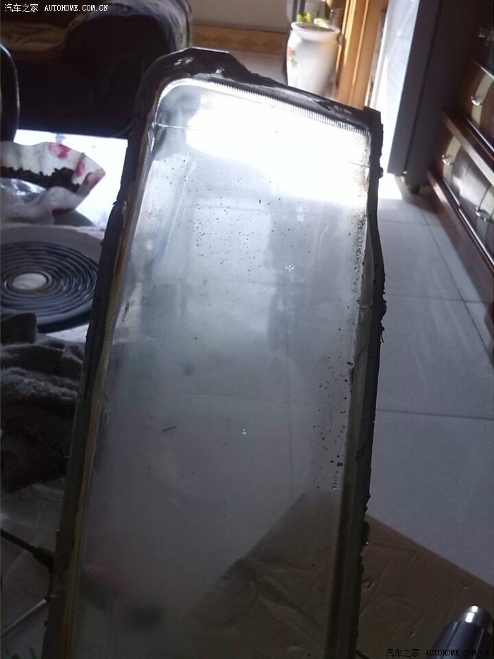 之后就是用热风枪给大灯加热,主要加热部分是灯壳与灯罩间的接合部位同。先从大灯的尖头做为起点,加热尖头及相邻两边(大概15CM区域),烤热后(大约4-5分钟),用平板改锥将灯壳上的卡子翘起,未加热前千万不敢翘哦,下来就是关键,把锥插入大灯尖端罩与壳的接合处,插入插入慢慢插入,再轻轻翘,使两者慢慢脱开一点缝,之后用两手用力扳(改锥不要拔出来),用力用力,这时你会发现缝越开越,可以停手歇息一下了:再拿起热风枪再继续沿开的缝继续往下烤,两边同时进行,壳有些软后,再重复之前动作,先用改锥挑开卡扣,再用两手往开扳,开张部位起越开越大:再继续烤,扳。大概重复4-5次就能完全达到罩、壳分离。看看扳下来的旧灯罩,脏吗