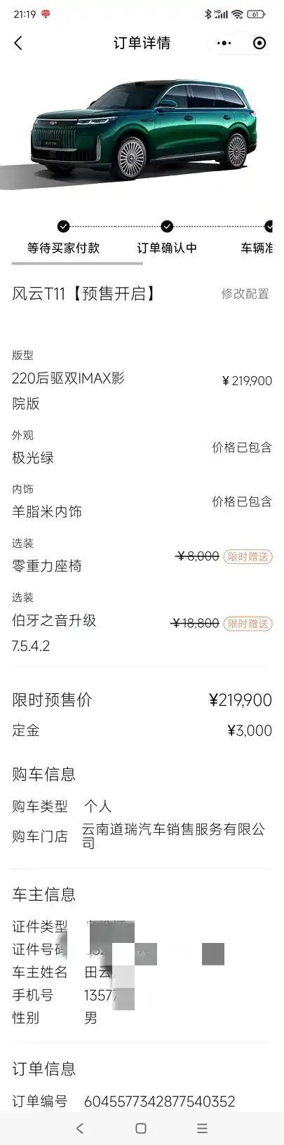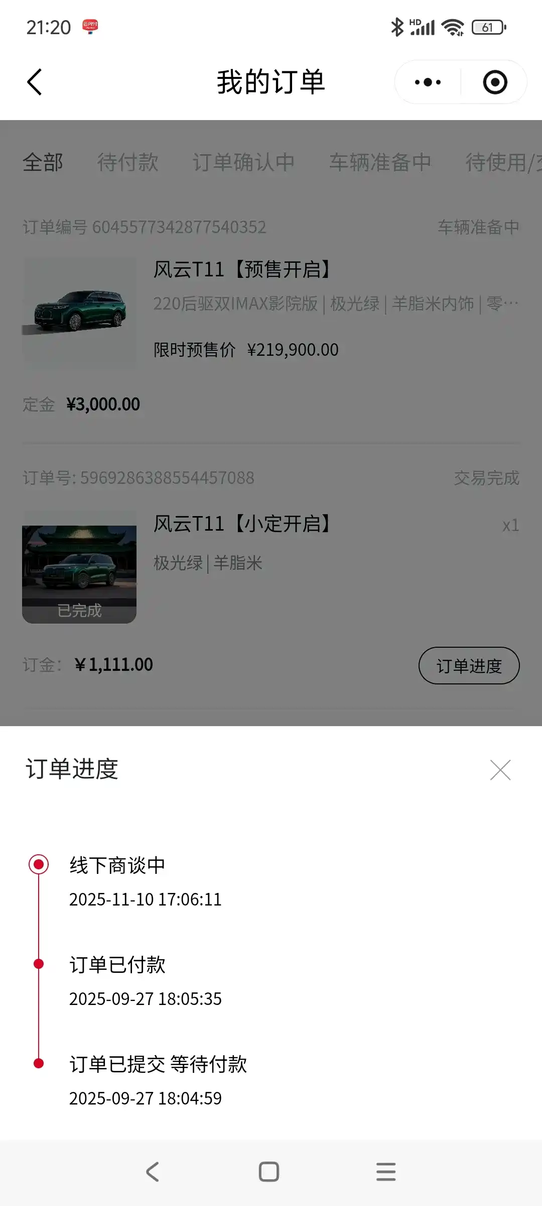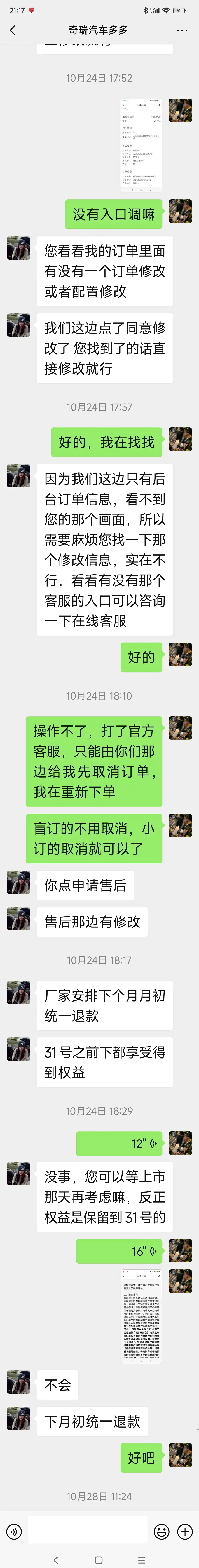 全网第一个奇瑞#风云T11##奇瑞汽车# 入坑的选手!说说我的经历吧,9月27日,盲订,因为确实喜欢造型,然后一直坚持到10月23日,预售,就付了3000,预定,这前面确实没有问题,官方客户,城市经销商第一时间联系,体验感很好。10月27号,因为想换其他车,家里领导嫌车大了,不好开,然后***操作来了,4S店销售回复说,11月头,如果确实不喜欢,厂家统一安排退款,详情看截图,一直到五号没有任何对接和联系,开始致电官方400电话,然后厂家推经销商,经销商推厂家,更***的操作来了,11月10日,本人没有任何操作,然后订单突然显示我在下午17点到店面谈,,更离谱的在后面,11日下午致电官方客户,要求跟进退款进度,然后回复已沟通经销商和大区经理,可以退款,一个小时后回复,然后就没有然后了。12日继续致电官方400,突然被告知车辆已经在运输中,无法退款。我天,没有到店面谈,你要签订车合同,就这样操作啦?#奇瑞汽车# #尹同跃称让出奇瑞产能保智界交付# #奇瑞风云# 难道奇瑞现在开始强买强卖啦?难道订单量都是这样来的啦?还好每次致电400都有电话录音,持续关注吧