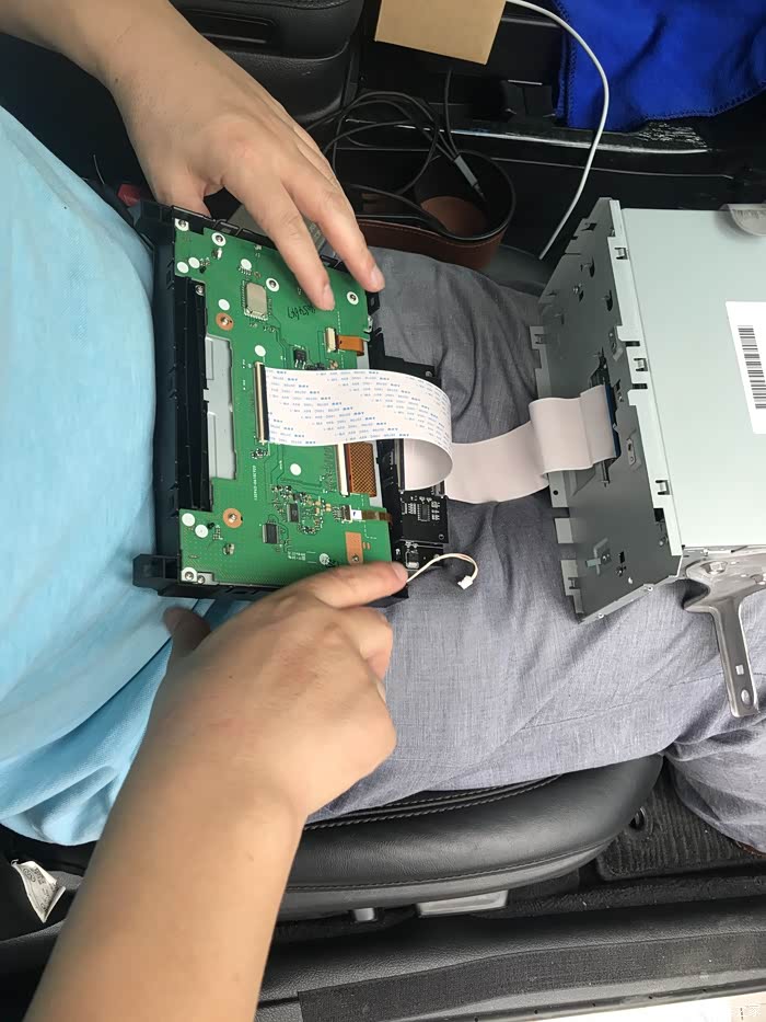 取下两颗螺丝后,徒手拉住中控外框下面缝隙,往上稍微用力拉一下就拆出来了,拆除外框后,四个螺丝取下,原车主机就算卸下来了。
