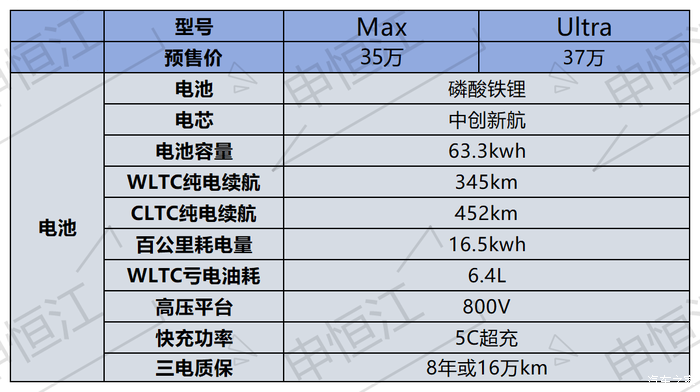 电池是中创新航的磷酸铁锂电池、63.3度、WLTC纯电续航345公里、CLTC纯电续航452公里、百公里耗电量16.5度、亏电油耗6.4L、800V高压充电平台、5C超充、三电质保8年或16万公里。