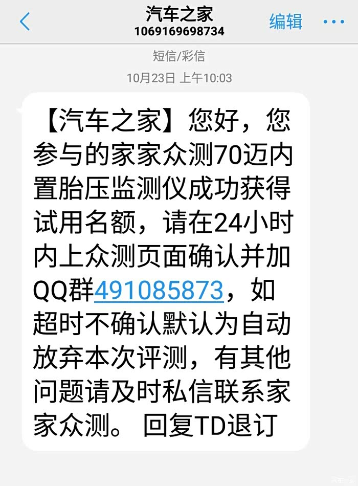 认识汽车之家也有些年头了,家家众测也是偶然间发现的,最初是抱着试试看的态度申请的,后来都没中,也就没那么在意了,申请后有积分可以兑换商品,积分多了也兑换了几个心爱之物,后来积分不好赚,打算不做了,专心看看论坛,看看新车,直到去年又进入家家众测,申请了几个,因为还有点积分,所以攒点再换点宝贝,偶尔看了一下我的众测,发现居然中奖了,获得了一件商品,欣喜若狂,打开一看,刚好错过,显示放弃众测,这才翻开短信发现真有短信提示,就这样断断续续的申请,将近一年时间,短信再次来袭,这次第一时间去了我的众测,确认了众测,这件商品正是我喜欢的70迈内置胎压监测仪…………