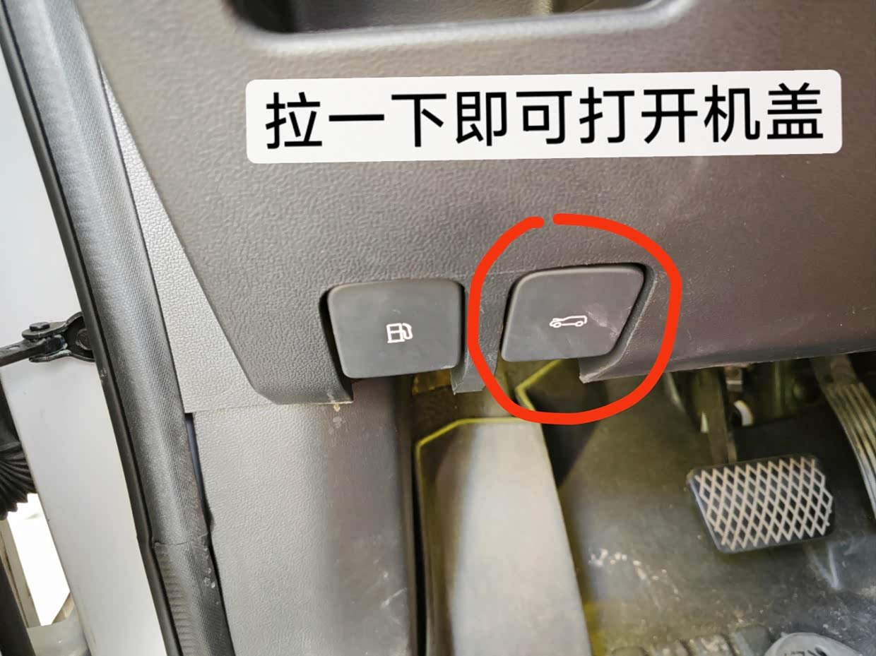 主驾的机盖手柄,轻轻一提,就可以把机盖打开一条缝了,这样设计也是为了行车中意外触碰到了,打开后不至于机盖完全弹开,影响行车安全。