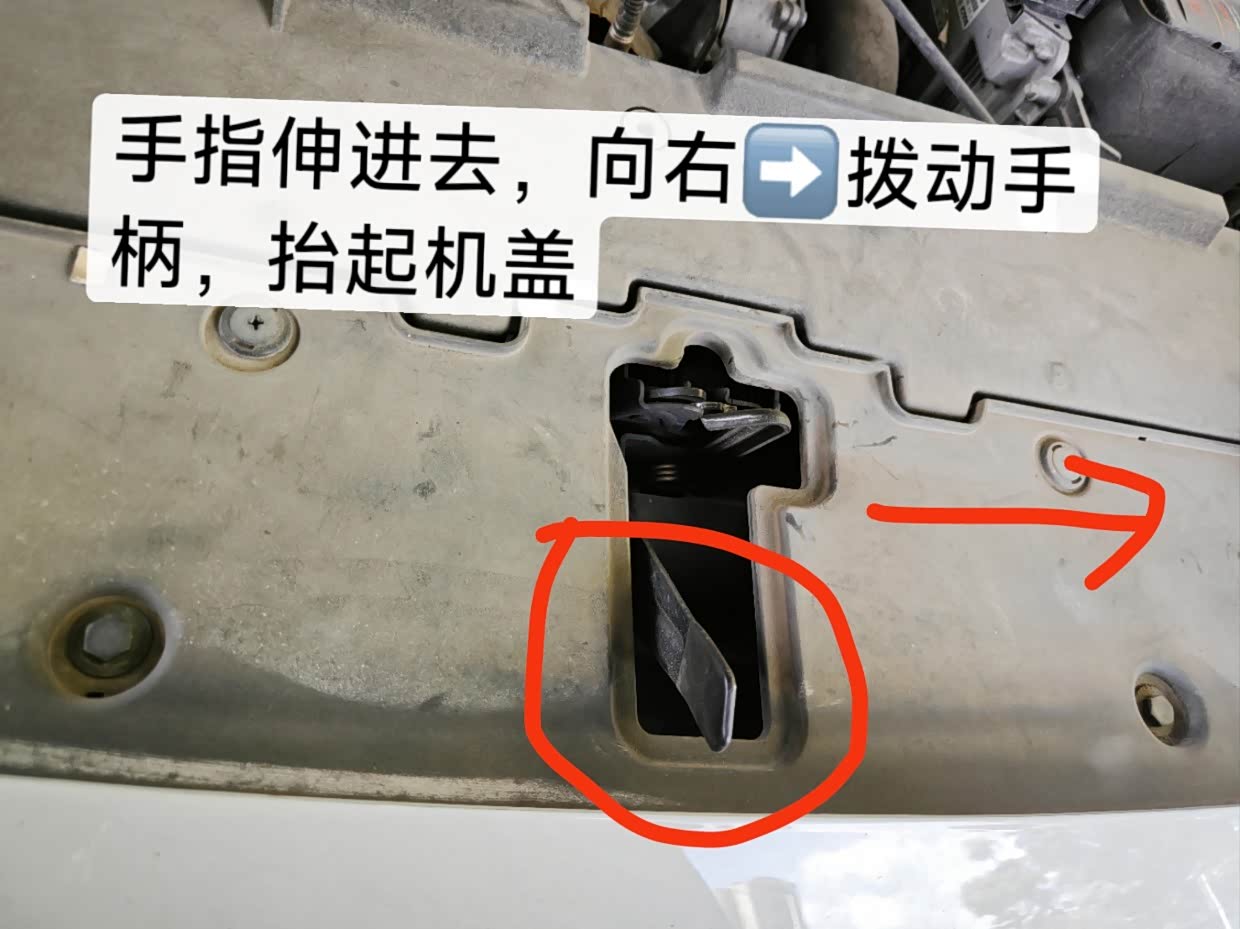 机盖打开一条缝后就可以把手伸进去,拨动一下二级锁的拨杆,同时把机盖抬起来,就完全打开机舱盖了。