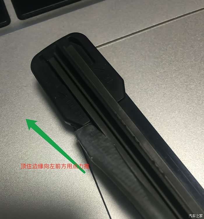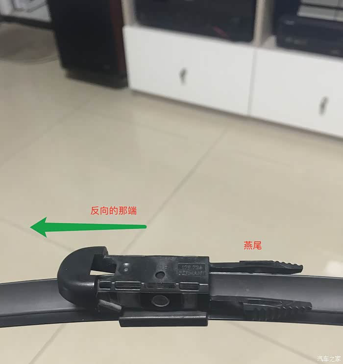 5,把燕尾扣扣回,要稍稍用点力,注意别安翻了,如果忘记方向,可以看一下另一根还未更换的雨刮条上燕尾的朝向,以胶条弧形斜面作为参考方向;