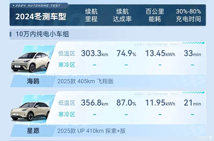 12月1日,之家冬测低温区成绩出炉,10万内纯电小车组里的吉利星愿成绩很惊艳。