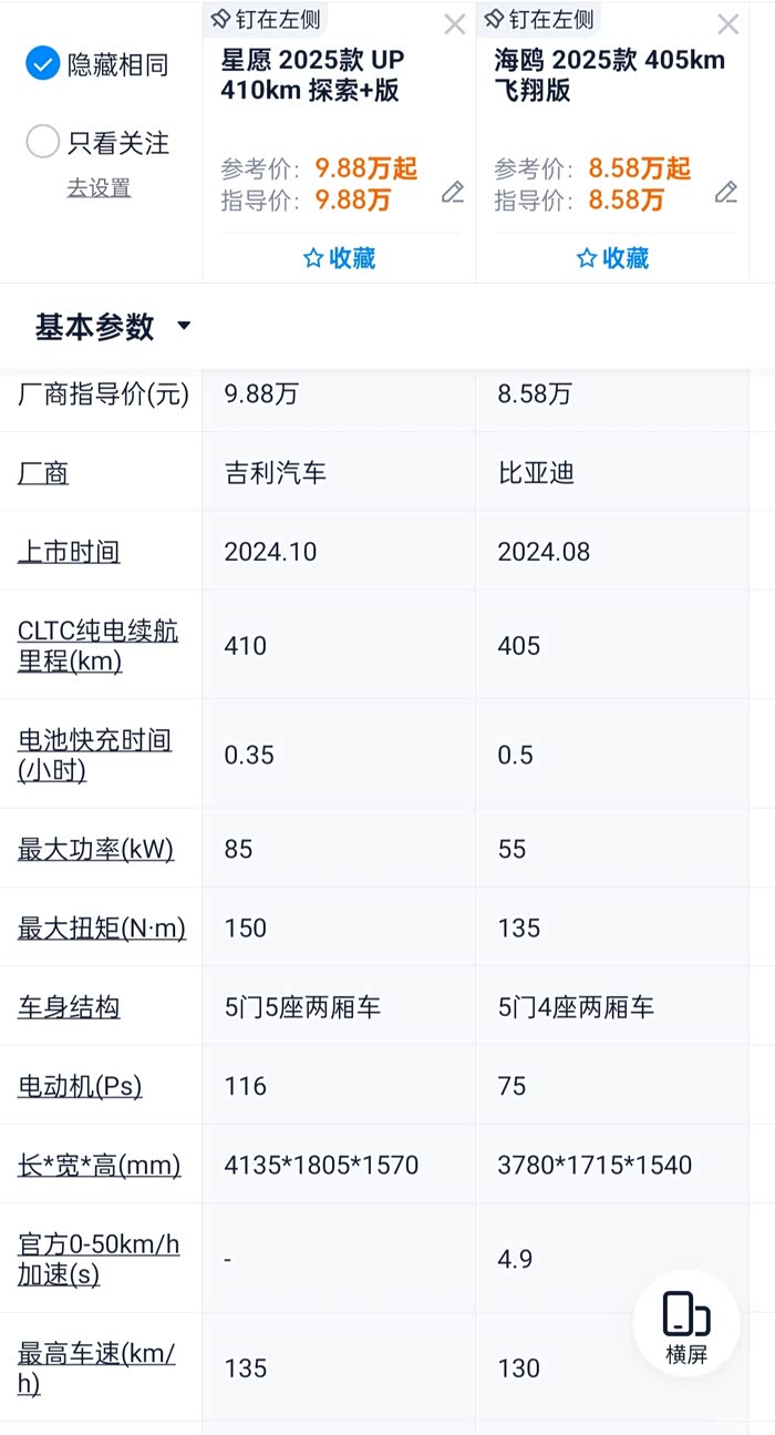 测试车辆:比亚迪海鸥2025款飞翔版和吉利星愿2025款探索+版。