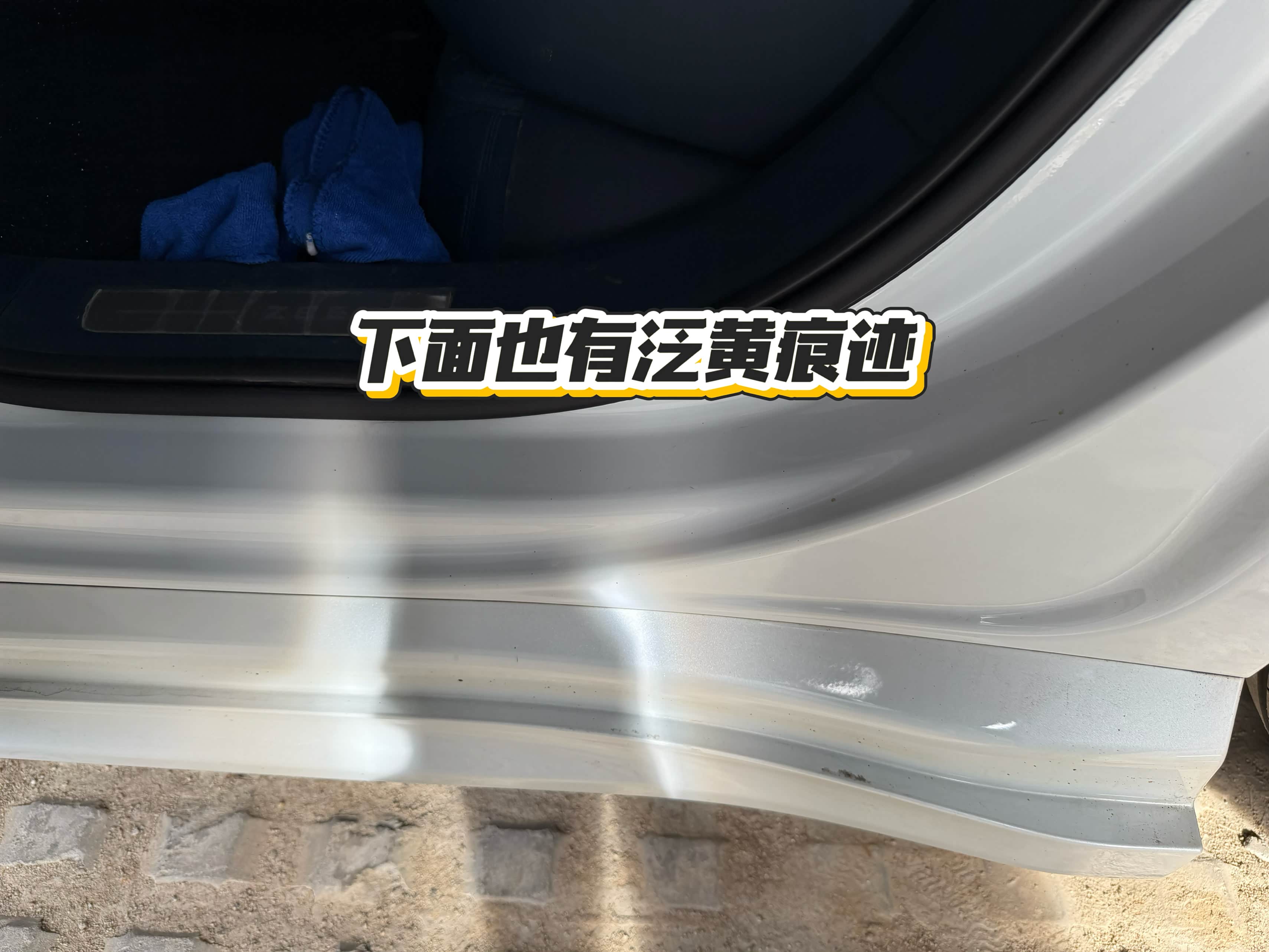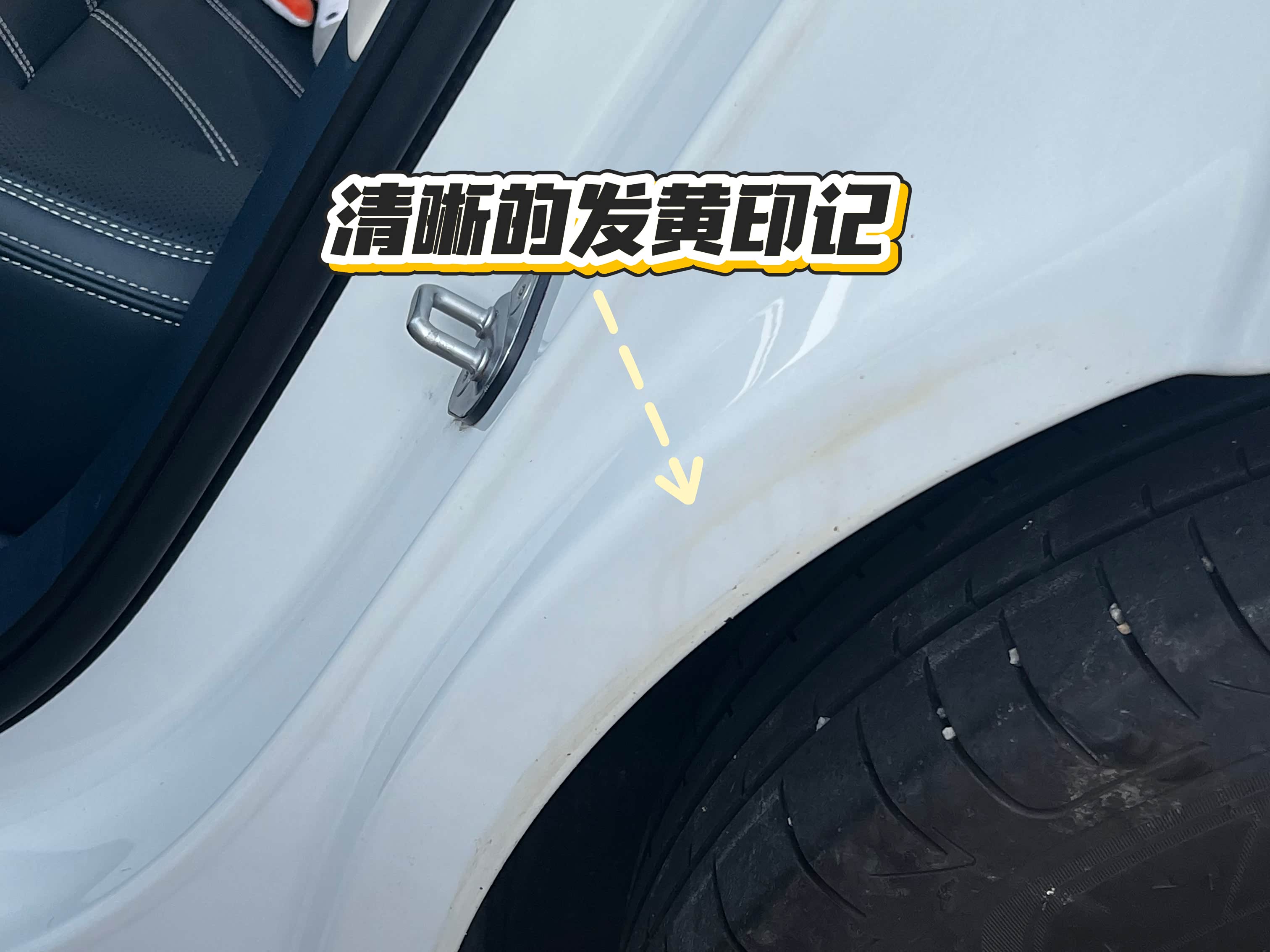 在上个月洗完车后,我发现左后门边框原本透亮的珍珠白车漆居然泛着一圈黄色污渍,非常扎眼。?